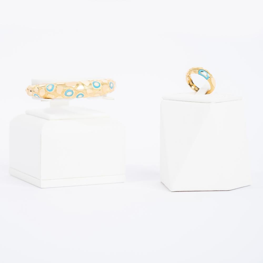مجموعة فاخرة تتكون من أسورة وخاتم مصنوعين من ذهب عيار 18 بتصميم مستوحى من رمزية عين الحُسن. تتميز هذه المجموعة بألوانها الزاهية وتفاصيلها العصرية التي تضيف لمسة من الجمال والتميز لإطلالتك اليومية أو المناسبات الخاصة. مثالية للمرأة التي تبحث عن تصميمات تعكس شخصيتها وأناقتها.