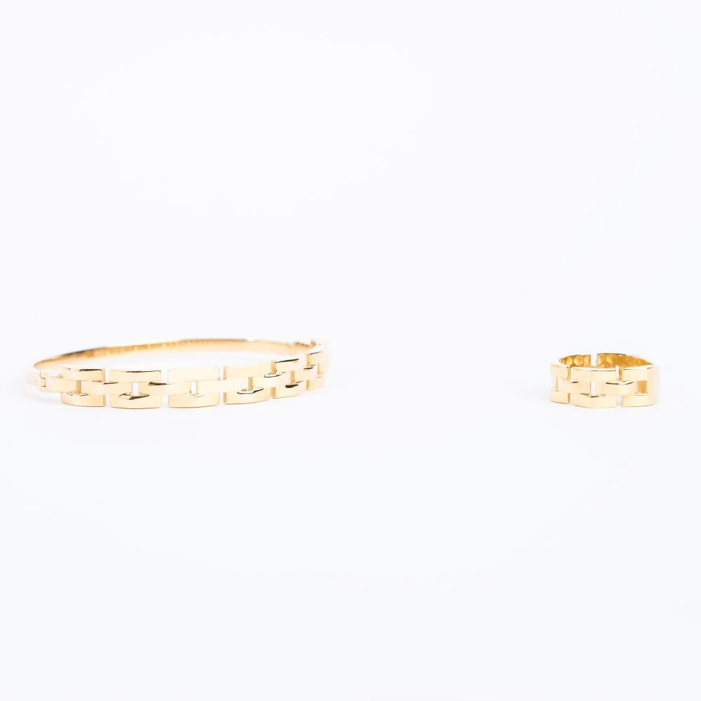 سوار جلامور الذهبي بتصميمه الحديث والراقي يعكس فخامة لا مثيل لها. يتميز بقطع ذهبية متراصة بدقة لتضفي لمسة من التألق على معصمك. مثالي للمناسبات الرسمية والإطلالات اليومية لإضافة بريق وأناقة لا تقاوم. مصنوع من ذهب عالي الجودة لضمان دوام وتألق يدوم معك.