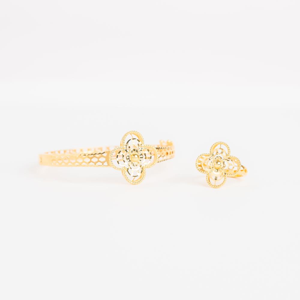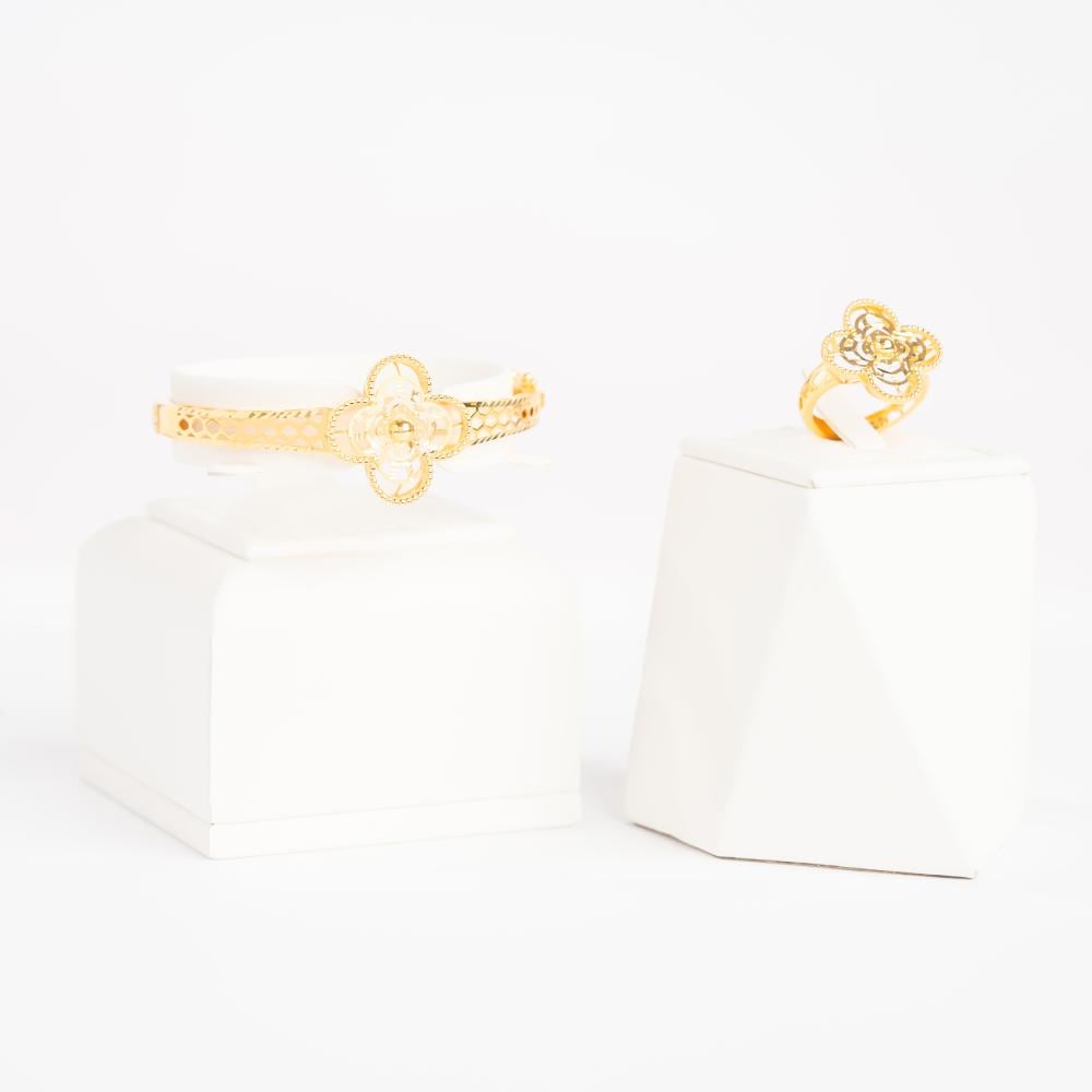 مجموعة “فان كليف” الفاخرة مصنوعة من الذهب عيار 21، تتألف من سوار وخاتم مستوحاة من التصميمات الكلاسيكية بأناقة الورود المتداخلة. تتميز بتفاصيل دقيقة تعكس جمال الطبيعة، مما يجعلها خيارًا مثاليًا لإطلالتك اليومية والمناسبات الخاصة. أضيفي لمسة راقية من الفخامة لإطلالتك مع هذه المجموعة الرائعة.