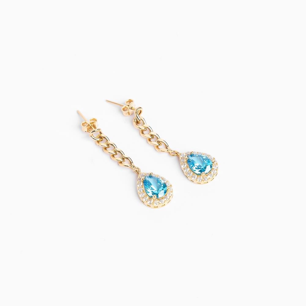 أقراط متدلية مصنوعة من الذهب الأصفر عيار 18، مزينة بأحجار زرقاء لامعة على شكل قطرة ماء محاطة بإطار من الألماس البراق. يتميز التصميم بسلسلة أنيقة تضيف لمسة من الانسيابية والجمال، مما يجعله خيارًا مثاليًا للمناسبات الخاصة والإطلالات المميزة.