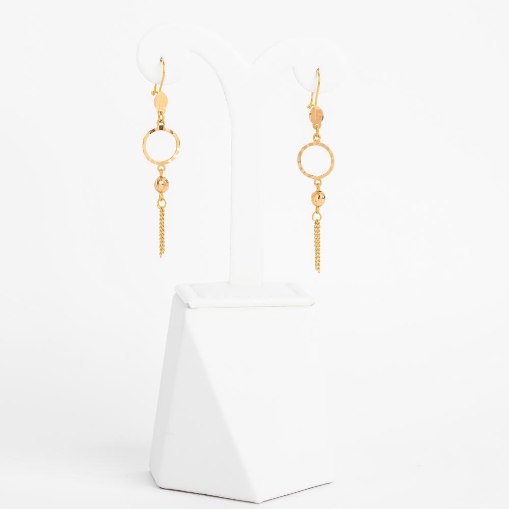 حلق متدلي مصنوع من الذهب الأصفر عيار 21، يتميز بسلسلة متشابكة بتصميم ملتف يعكس الإبداع والبساطة. تصميمه الأنيق والخفيف يجعله مثاليًا للإطلالات اليومية والمناسبات الخاصة، مما يضيف لمسة من الرقي والجاذبية لأي مظهر. قطعة فريدة تعكس ذوقًا عصريًا وراقيًا.