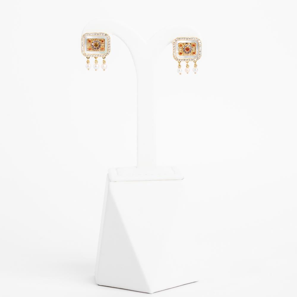 حلق فاخر مصنوع من الذهب المطعم بتفاصيل فنية ساحرة، يتميز بتصميم مستطيل مزين بأحجار ملونة بألوان زاهية، مع لمسات من الزركون المحيط بالإطار لإبراز جمال التصميم. تتدلى منه قطع صغيرة تضيف حركة ورونقًا خاصًا، مما يجعله قطعة مميزة تضفي على إطلالتك لمسة من الفخامة والجاذبية.