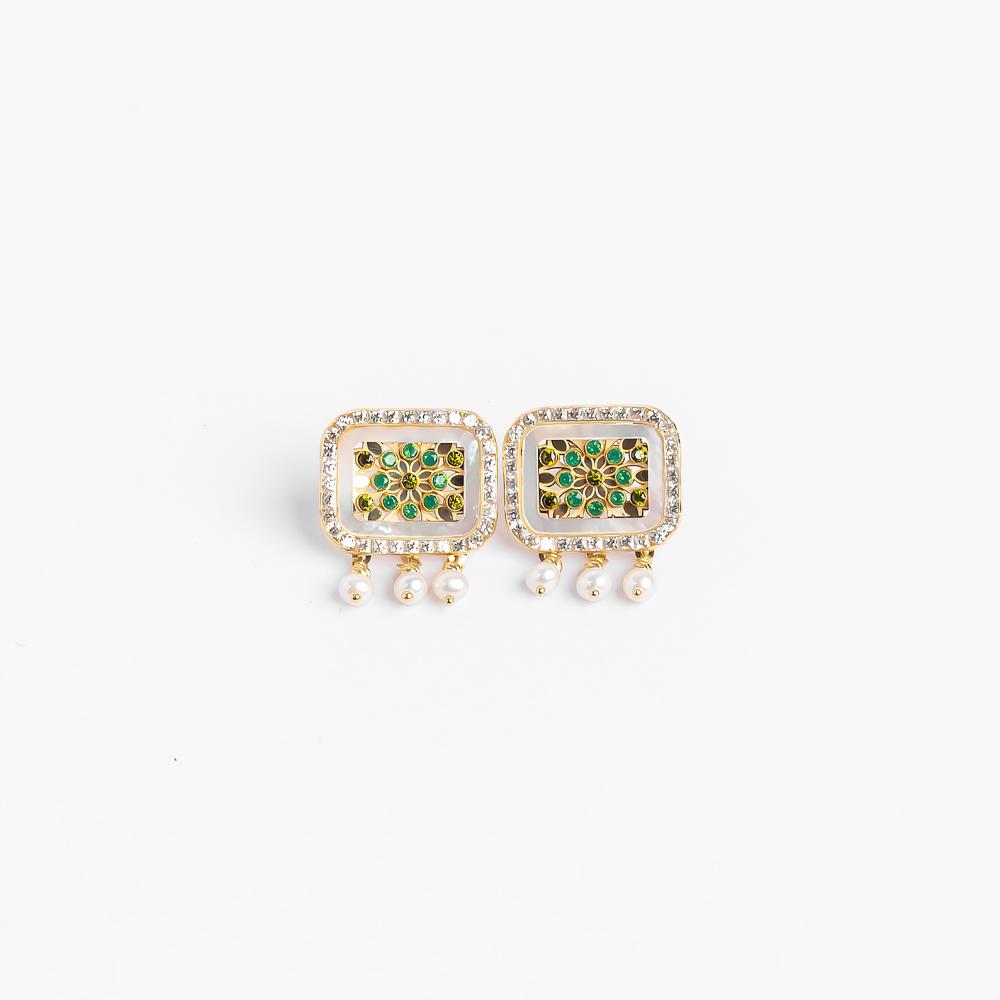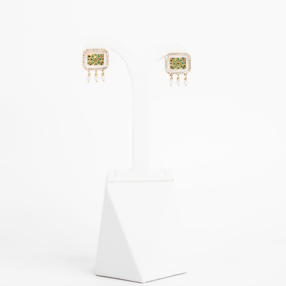 حلق فاخر مصنوع من الذهب المطعم بتفاصيل فنية ساحرة، يتميز بتصميم مستطيل مزين بأحجار ملونة بألوان زاهية، مع لمسات من الزركون المحيط بالإطار لإبراز جمال التصميم. تتدلى منه قطع صغيرة تضيف حركة ورونقًا خاصًا، مما يجعله قطعة مميزة تضفي على إطلالتك لمسة من الفخامة والجاذبية.