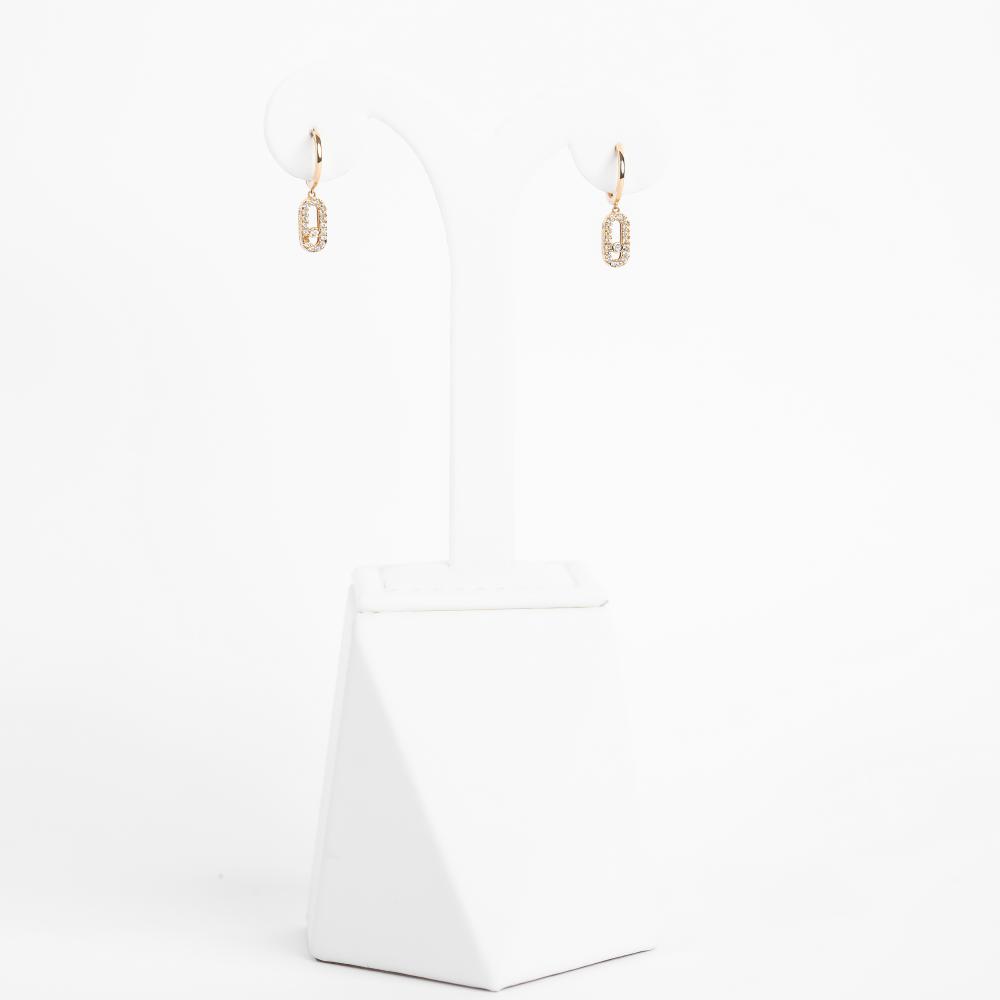 حلق أنيق مصنوع من الذهب عيار 18، يتميز بتصميم متدلي يعكس البساطة والفخامة في آنٍ واحد. الحلق مزين بأحجار زركون براقة مرتبة بعناية لتضفي لمسة من الجاذبية واللمعان. تصميم مثالي يليق بالإطلالات اليومية والمناسبات الخاصة، لإبراز جمالك بأسلوب راقٍ.