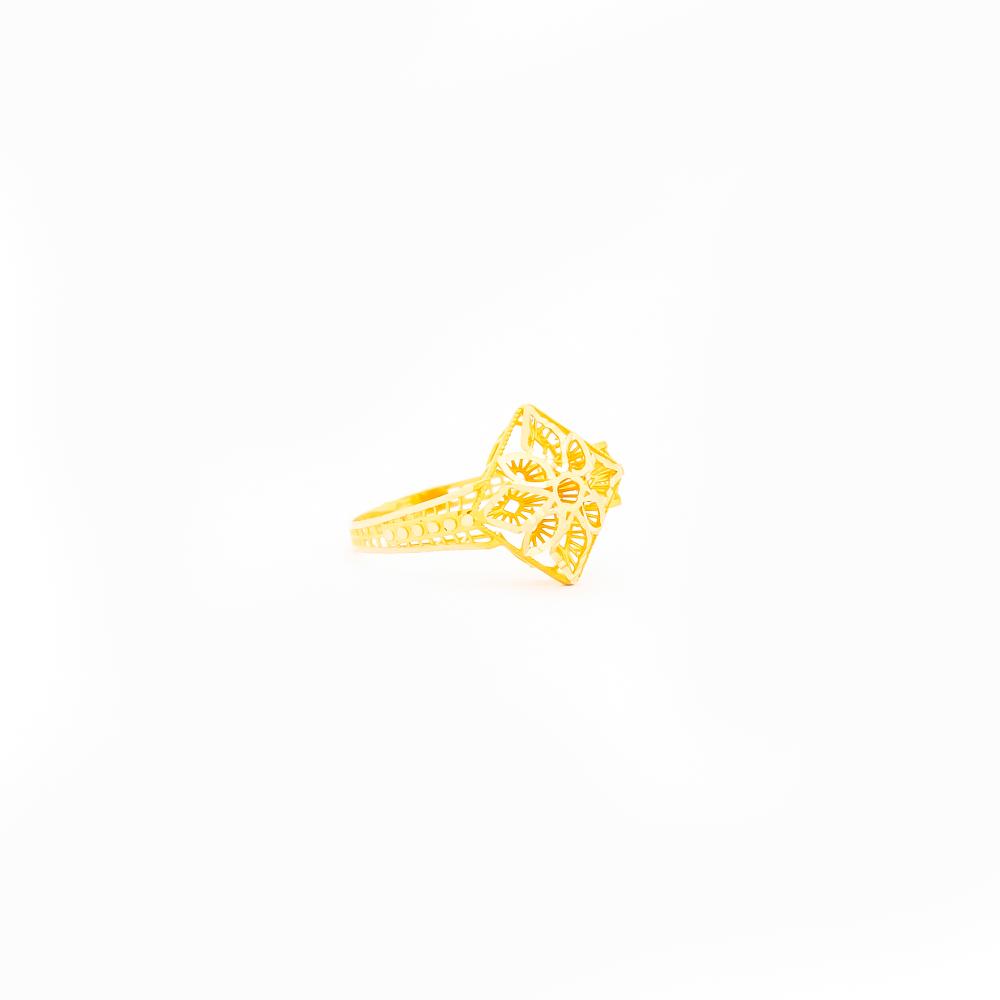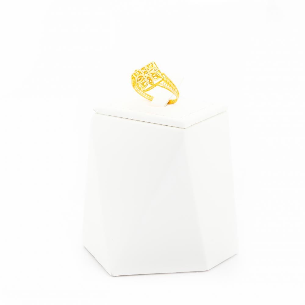 “خاتم فاخر مصنوع من الذهب عيار 21، يتميز بتصميم مستوحى من أشكال هندسية تعكس غموض وجمال مثلث برمودا. يمتاز بتفاصيل دقيقة وزخارف متناغمة تضفي عليه لمسة من الحداثة والفخامة، ليكون قطعة مميزة تناسب كل الإطلالات وتُبرز الذوق الرفيع.”