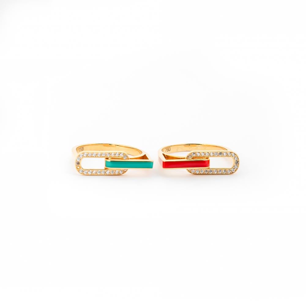 خاتم عصري مصنوع من الذهب عيار 18، يتميز بتصميم الروابط المتداخلة والمزينة بفصوص براقة. يضفي الألوان الجريئة مثل الأحمر والأخضر لمسة من الحيوية والأناقة. تصميمه الفريد يجعل منه قطعة مميزة تناسب الإطلالات اليومية والمناسبات الخاصة، مما يعكس أسلوباً حديثاً وراقياً.