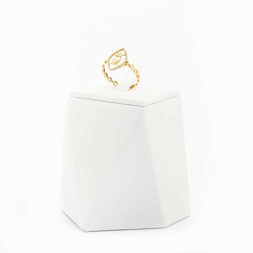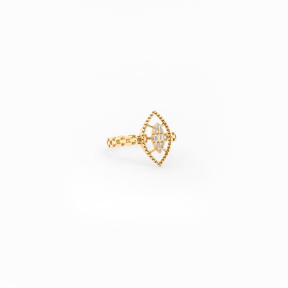 خاتم أنيق مصنوع من الذهب بتصميم يشبه الدرع الملكي، مزين بأحجار براقة تضيف لمسة من الفخامة. يتميز بتفاصيله الدقيقة التي تمنح الإطلالة جرعة من التميز والرقي. مثالي للمناسبات الخاصة والإطلالات اليومية.