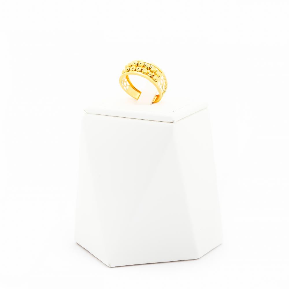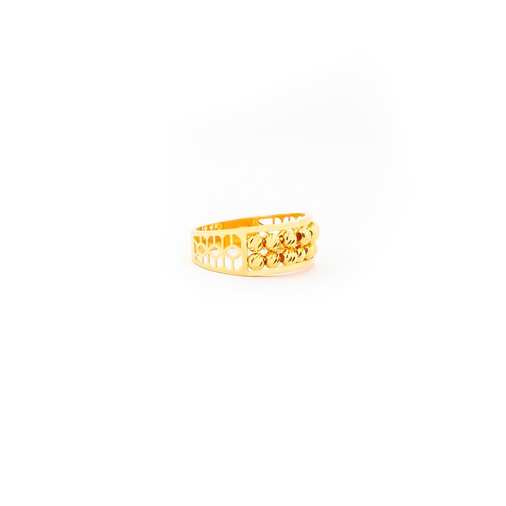 “خاتم أنيق مصنوع من الذهب عيار 21، يتميز بتصميم هندسي مبتكر يجمع بين الزخارف الشبكية والنقوش البارزة. تتوزع الكرات الذهبية اللامعة على جانب واحد، مما يضيف لمسة فريدة وعصرية. خاتم يجمع بين الكلاسيكية والحداثة، ليكون قطعة مثالية للإطلالات اليومية والمناسبات الخاصة.”