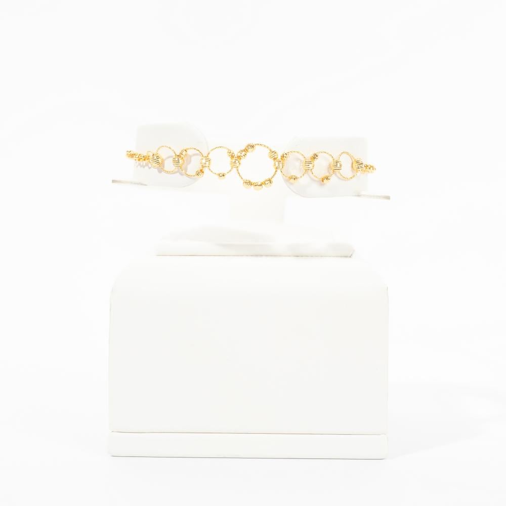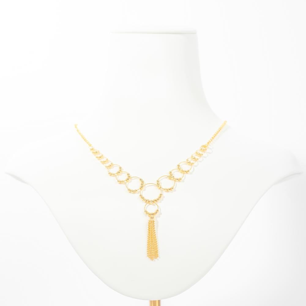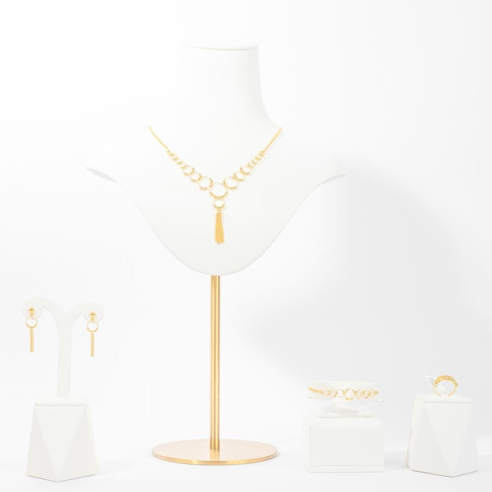 طقم ساحر يجسد انسجام الأناقة والفخامة بتصميم مستوحى من الأنغام المتناغمة. يتميز العقد بسلاسل ذهبية تتداخل في حلقات أنيقة تنتهي بتفاصيل متدلية تضفي لمسة من الحيوية والجاذبية. القطع المكملة للطقم تضيف تناسقًا وأناقة مثالية، مما يجعله خيارًا مميزًا لإطلالات المساء والمناسبات الخاصة.