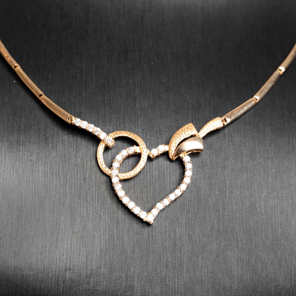 “عقد فاخر يحمل اسم الحب الأبدي، مصمم برقي ليعبر عن أسمى مشاعر الارتباط والتفاني. يتميز بقلب متلألئ يرمز إلى الحب الأبدي، مع تفاصيل ذهبية أنيقة وسلسلة انسيابية تمنح تصميمه لمسة من الجمال الكلاسيكي والعصري. قطعة مثالية للتعبير عن المشاعر العميقة وتخليد اللحظات الخاصة.”