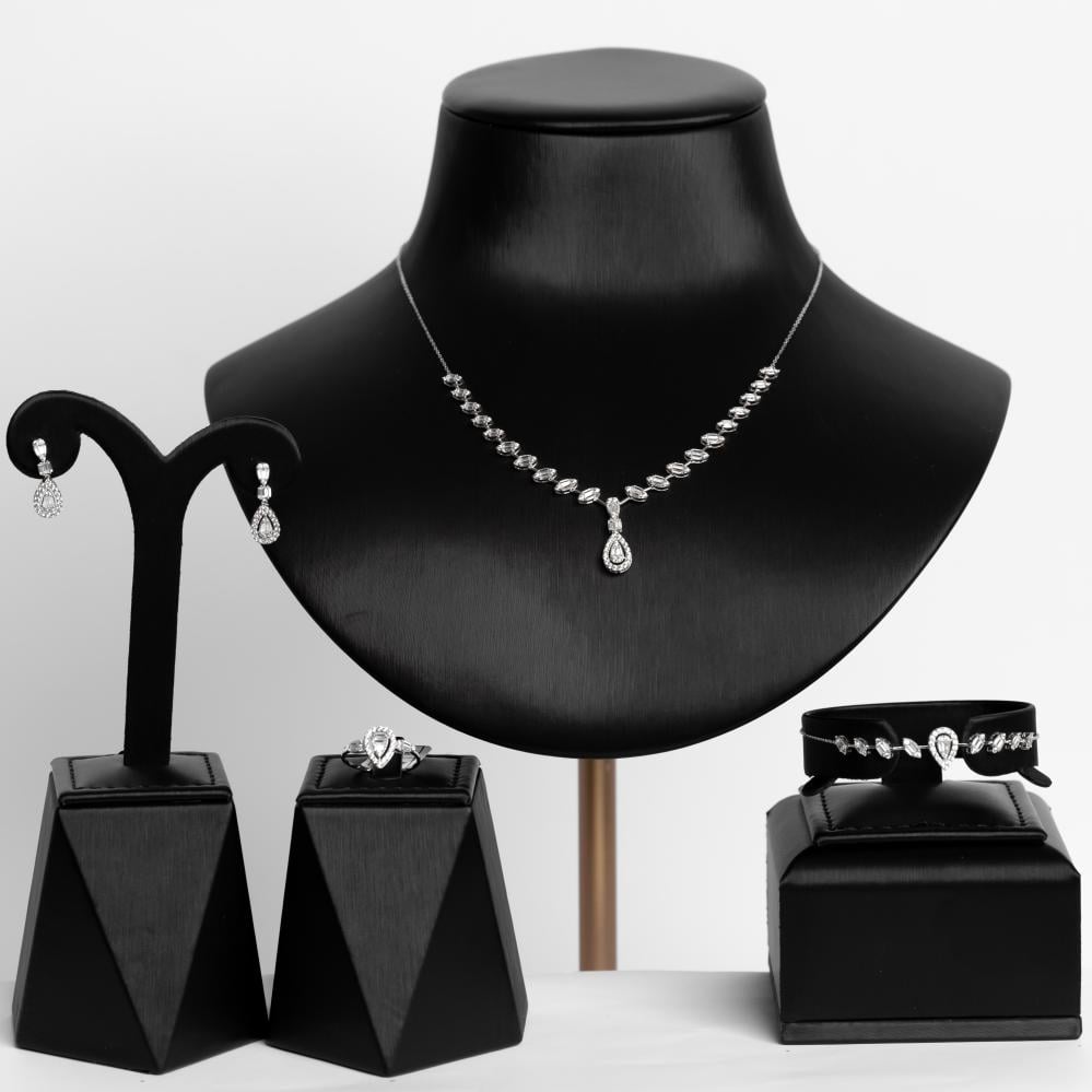 “طقم لورا هو تجسيد للأناقة والرقة، مستوحى من الجمال الطبيعي والتصميم المتناغم. اسم لورا يعود أصله إلى اللاتينية ويعني “اللوريل” أو “شجرة الغار”، التي كانت تستخدم في العصور القديمة للتكريم والفخر. يعكس هذا الاسم الفخامة والنبل، مما يجعل الطقم يعبر عن التميز والرفعة. يتكون من قطع ذهبية عيار 18، ليضيف لمسة من التألق والأنوثة في كل مناسبة.”