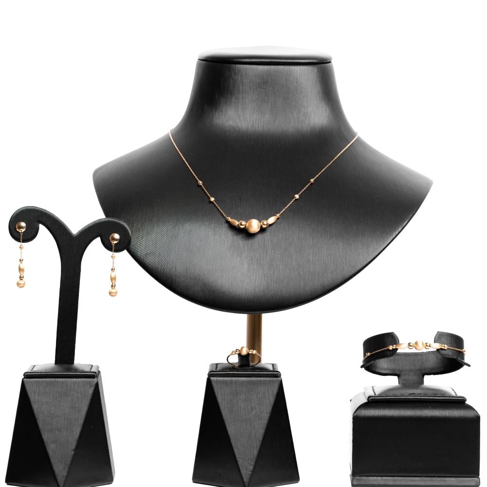 الأقراط والسوار والخاتم المصاحبة تضيف تكاملاً رائعًا للطقم، مما يعكس جمال التفاصيل المتناسقة ويضفي لمسة من الأنوثة الراقية.