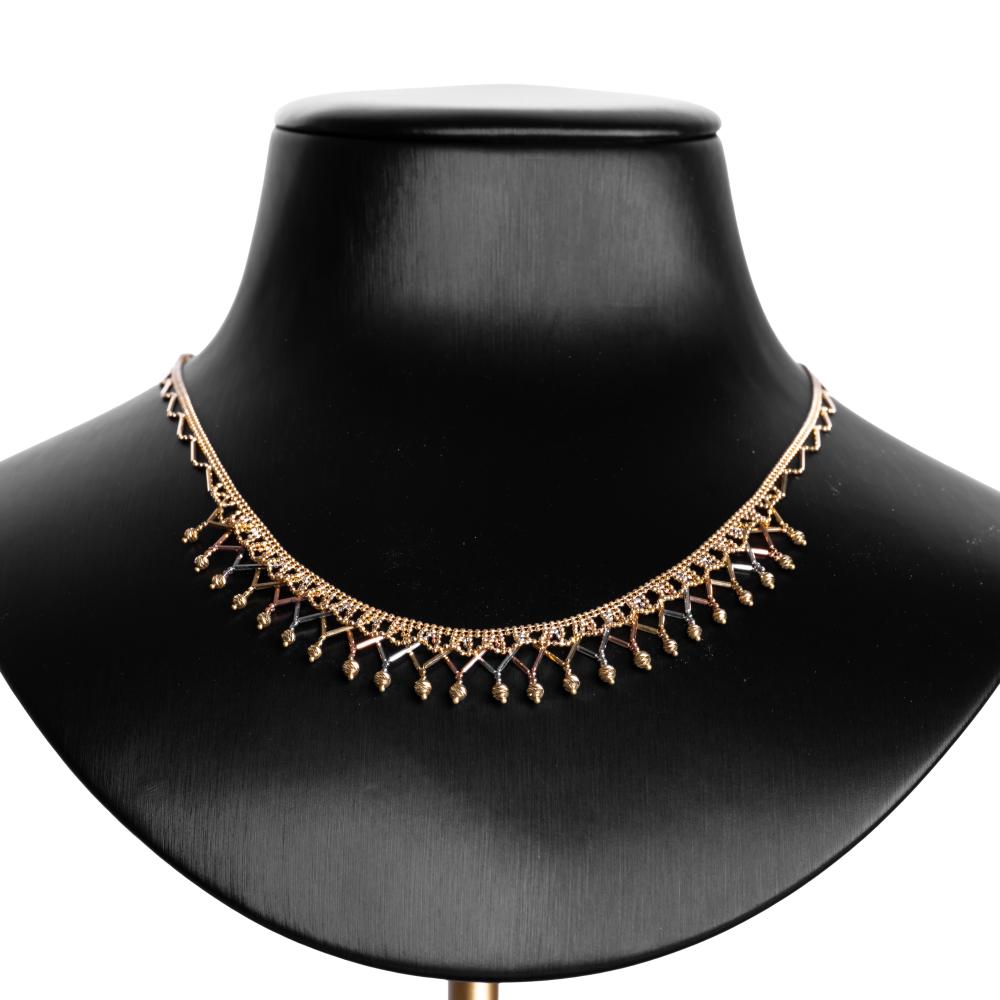 قلادة ساحرة مستوحاة من غموض وجاذبية مثلث برمودا. تتميز بتصميمها الفريد على شكل مثلثات متداخلة وسلاسل متدلية تضفي لمسة من الجمال والتألق. مصنوعة من الذهب عيار 18، وتُعد خيارًا مثاليًا للإطلالات المميزة والمناسبات الخاصة.
