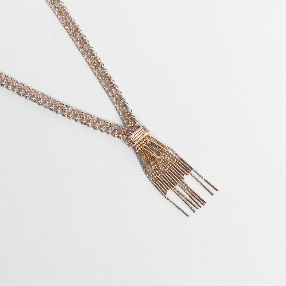 قلادة ذهبية أنيقة تتميز بتصميم متدرج يشبه الأعمدة المتدلية. مصنوعة من الذهب عيار 18، وتبرز براعة التصنيع وجمالها الكلاسيكي. مثالية لإضافة لمسة من الرقي إلى الإطلالات اليومية والمناسبات الخاصة
