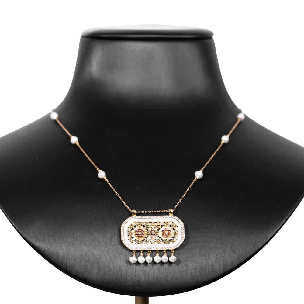 عقد مميز مستوحى من أجواء شهر رمضان الكريم، مصنوع من الذهب عيار 18 قيراط. يتميز بحلية مركزية مستطيلة مزخرفة بزخارف شرقية أنيقة ومزينة بأحجار كريمة وردية. يتدلى منه مجموعة من اللآلئ الصغيرة لإضفاء لمسة تقليدية وفاخرة. يناسب هذا العقد الإطلالات الرمضانية والمناسبات الخاصة ليكمل جمالك برقي