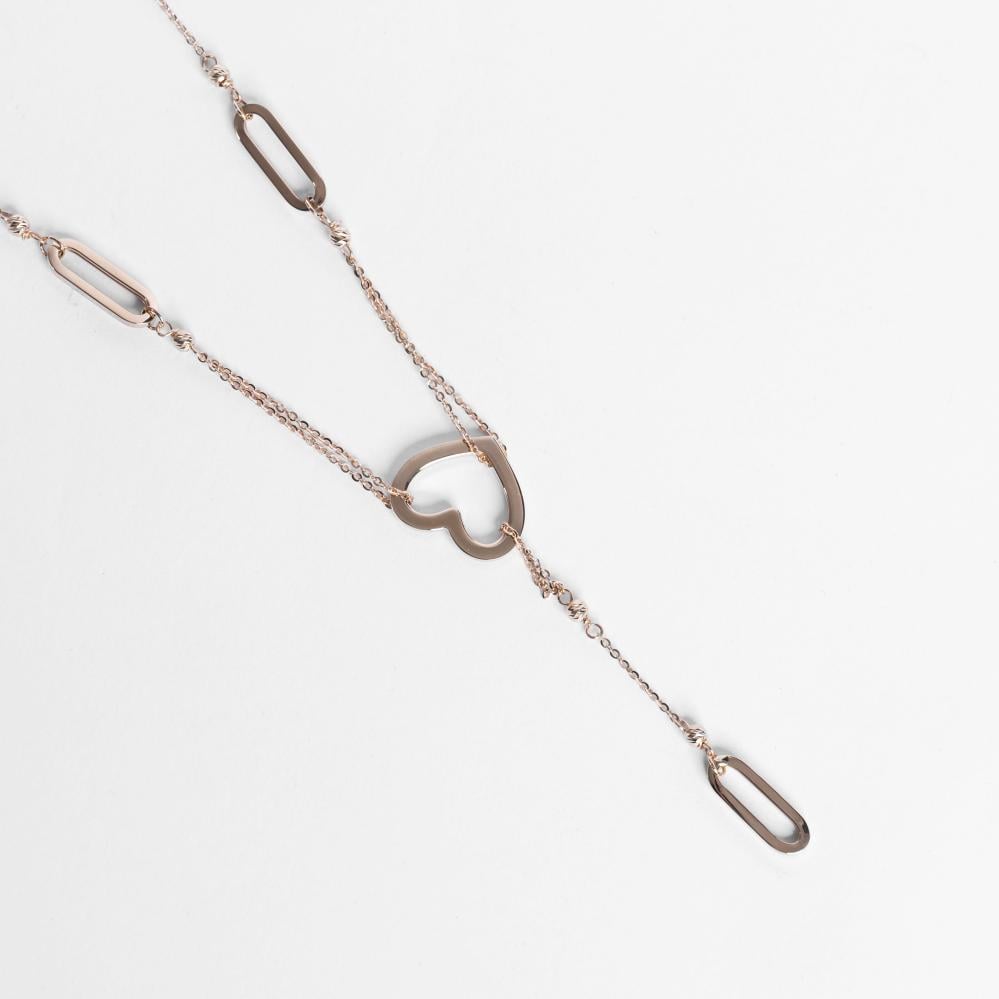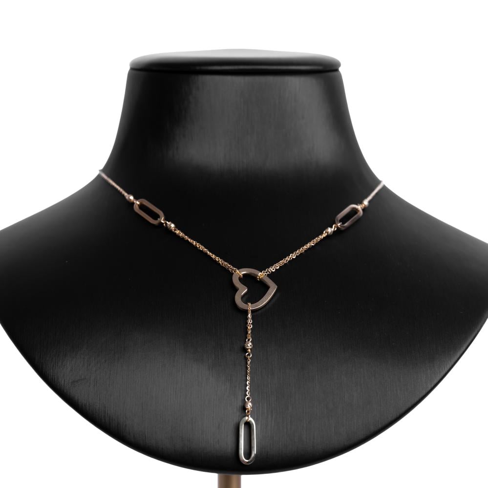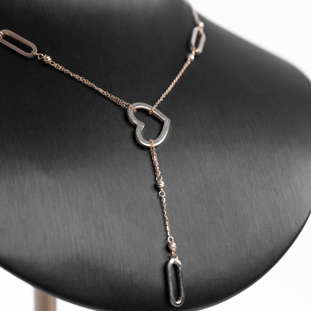 عقد أنيق مصنوع من الذهب عيار 18 بتصميم عصري وناعم. يتميز بشكل قلب مفتوح في الوسط مع سلسلة متدلية تنتهي بحلقات مستطيلة، مما يضفي لمسة من التوازن والجمال. تصميمه الفريد يعبر عن البساطة والأنوثة، مما يجعله مثاليًا للإطلالات اليومية والمناسبات الخاصة. قطعة تضيف لمسة من الرقي لكل من ترتديها.