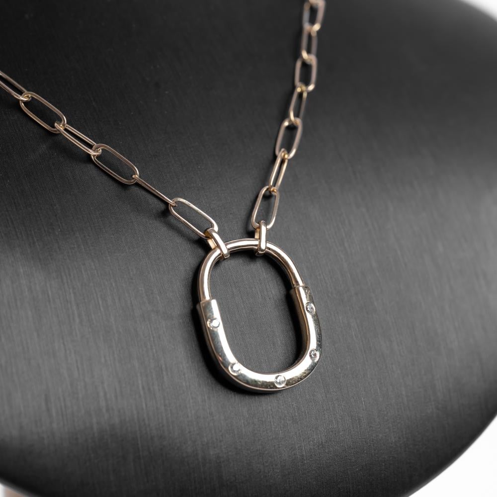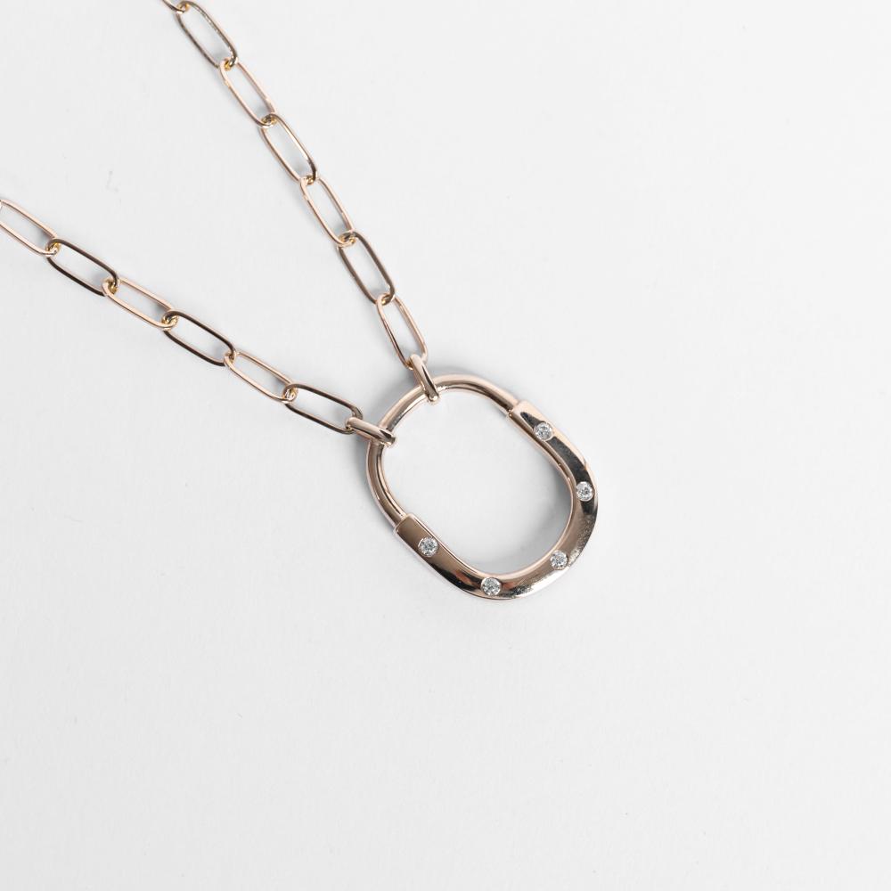 عقد أنيق مصنوع من الذهب عيار 18 قيراط بتصميم مستوحى من الطابع الملكي. يتميز بسلسلة من الحلقات المتشابكة وحلية مركزية بيضاوية مزخرفة بتفاصيل دقيقة تضيف لمسة من الفخامة والرقي. تصميمه يجمع بين البساطة والجاذبية، مما يجعله مناسبًا للإطلالات الكلاسيكية والعصرية على حد سواء.